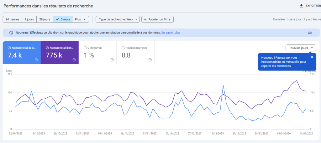 Par exemple, il permet d’identifier un article bien positionné mais sous-exploité, de corriger une page importante qui n’est pas indexée ou encore de détecter une baisse de visibilité avant qu’elle n’impacte fortement le trafic.